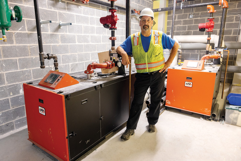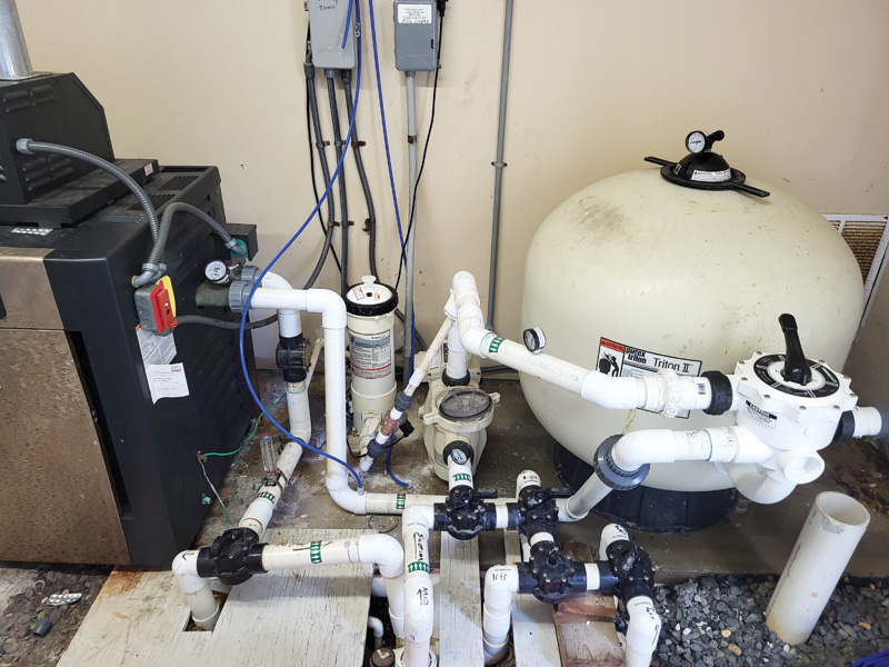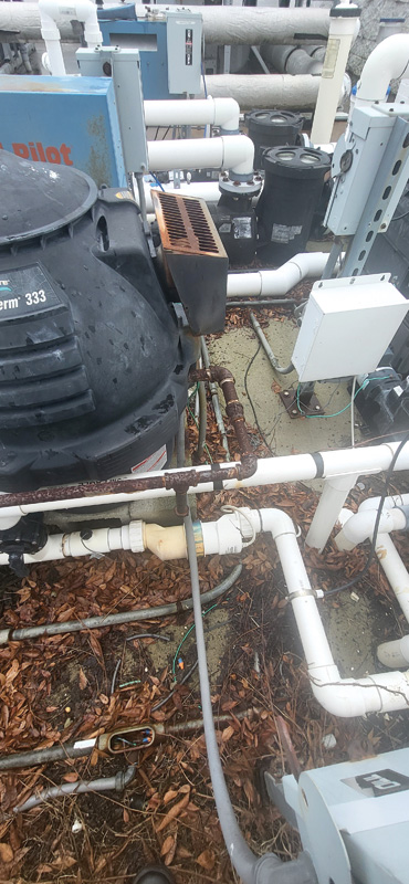 The author is in a partially completed mechanical room that serves two outdoor pools at a large condo facility.