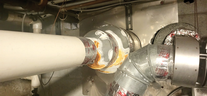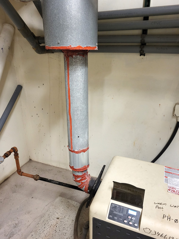 The manufacturer of this high-efficiency condensing pool heater specifies a polyvinyl chloride (PVC) vent system. Still, the installer ran PVC for about 1.52 m (15 ft) before transitioning into the existing vent system. The corrosion on the galvanized transition is indicative of condensate damage.